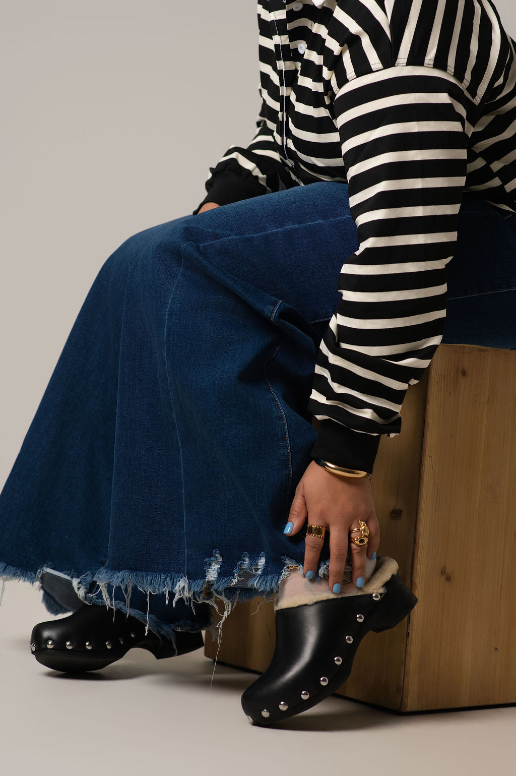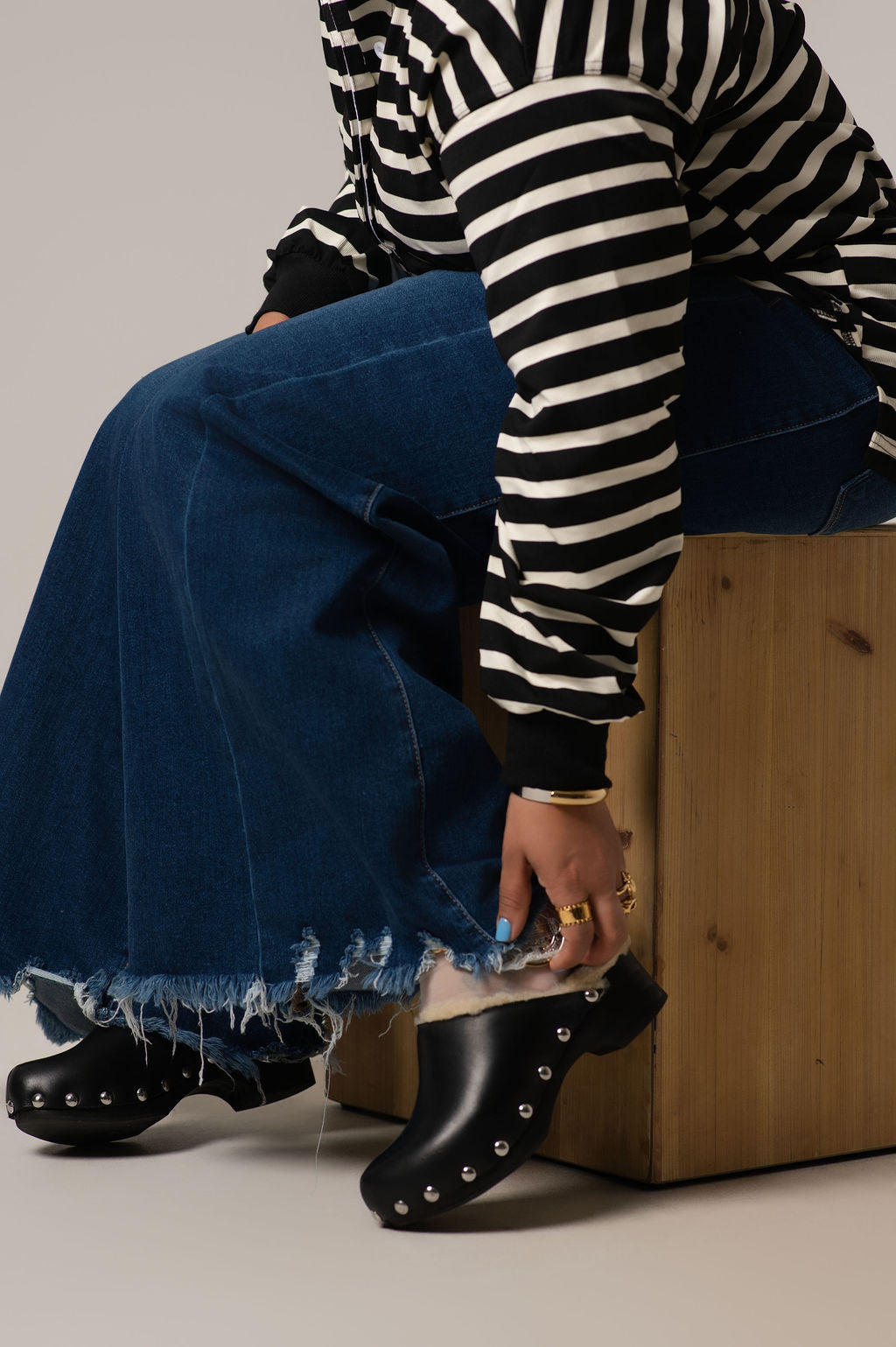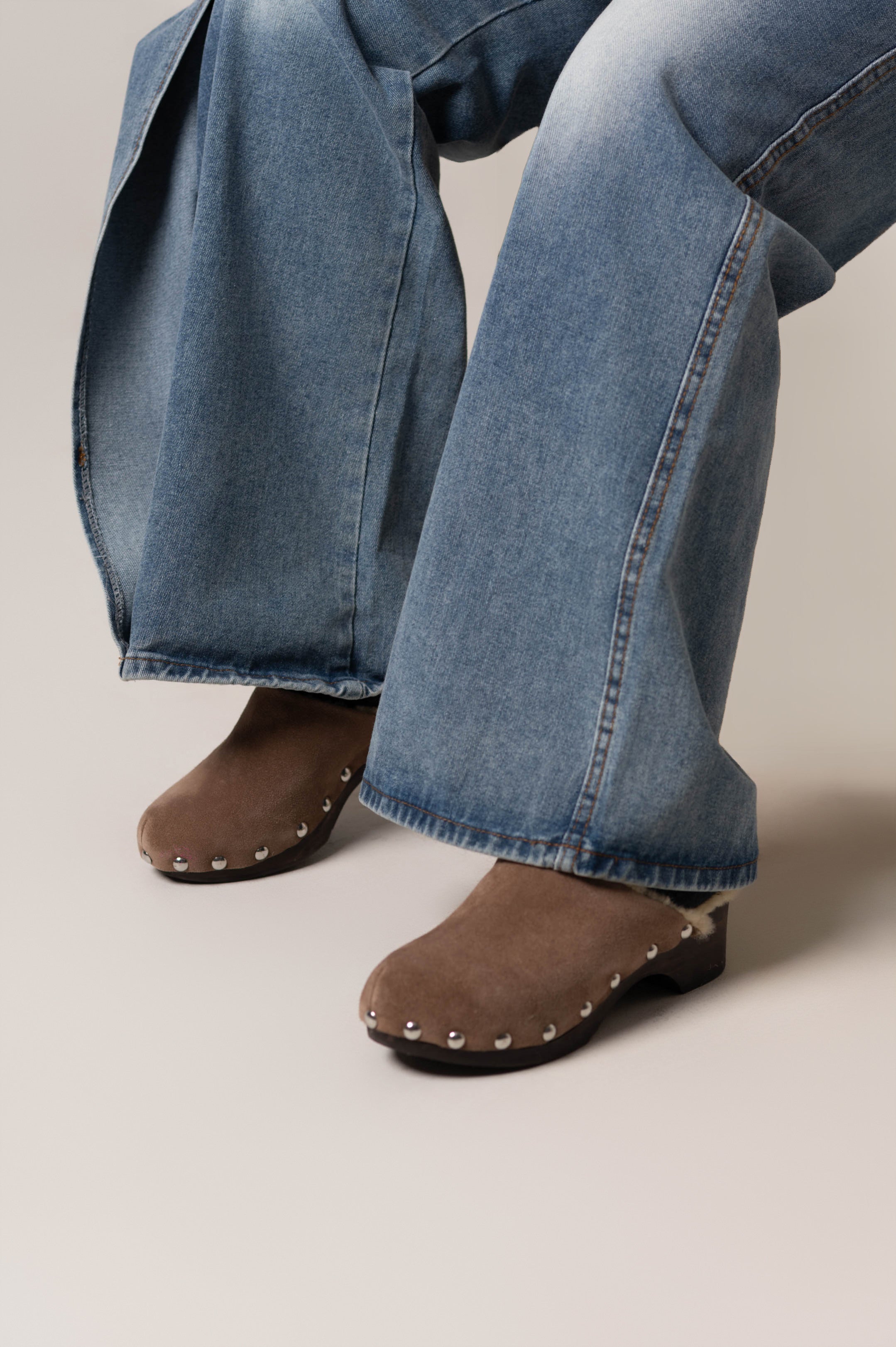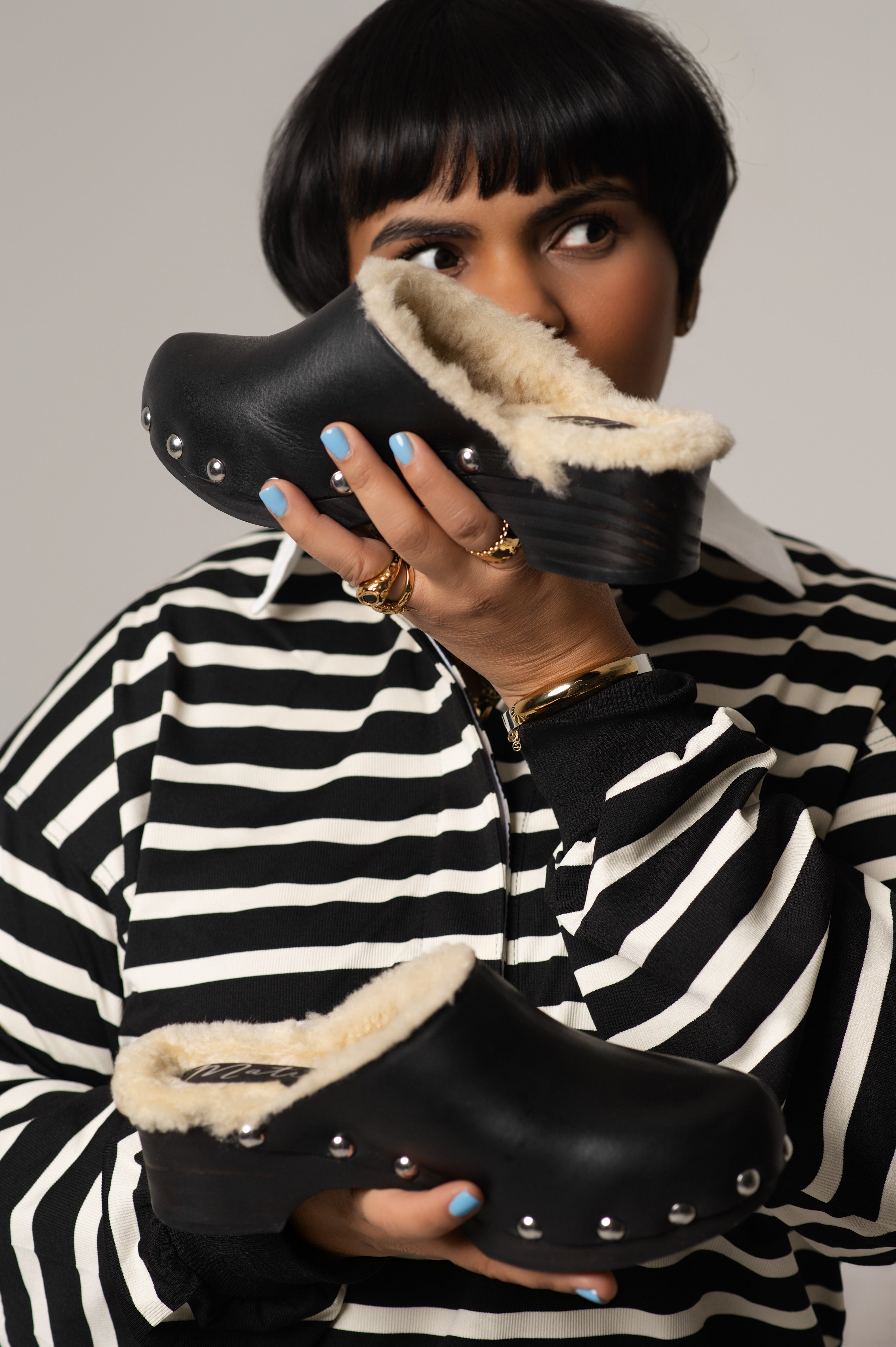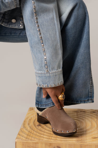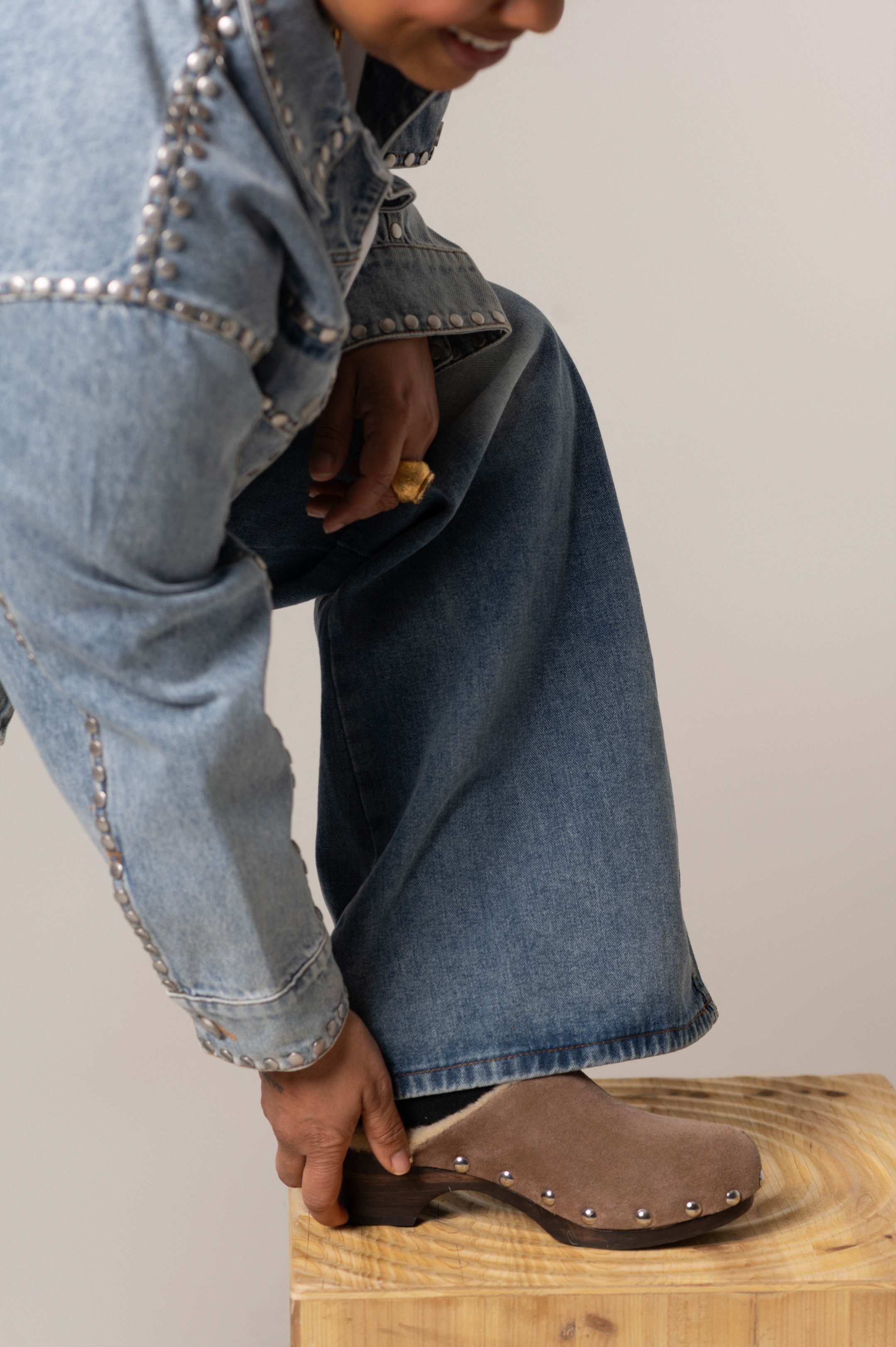 The  Shearling Clogs offer effortless style and comfort with a slip-on design, plush shearling lining, and padded insole. The sturdy wooden heel and nailhead trim add a touch of sophistication. Easy to wear and versatile, perfect for any occasion.