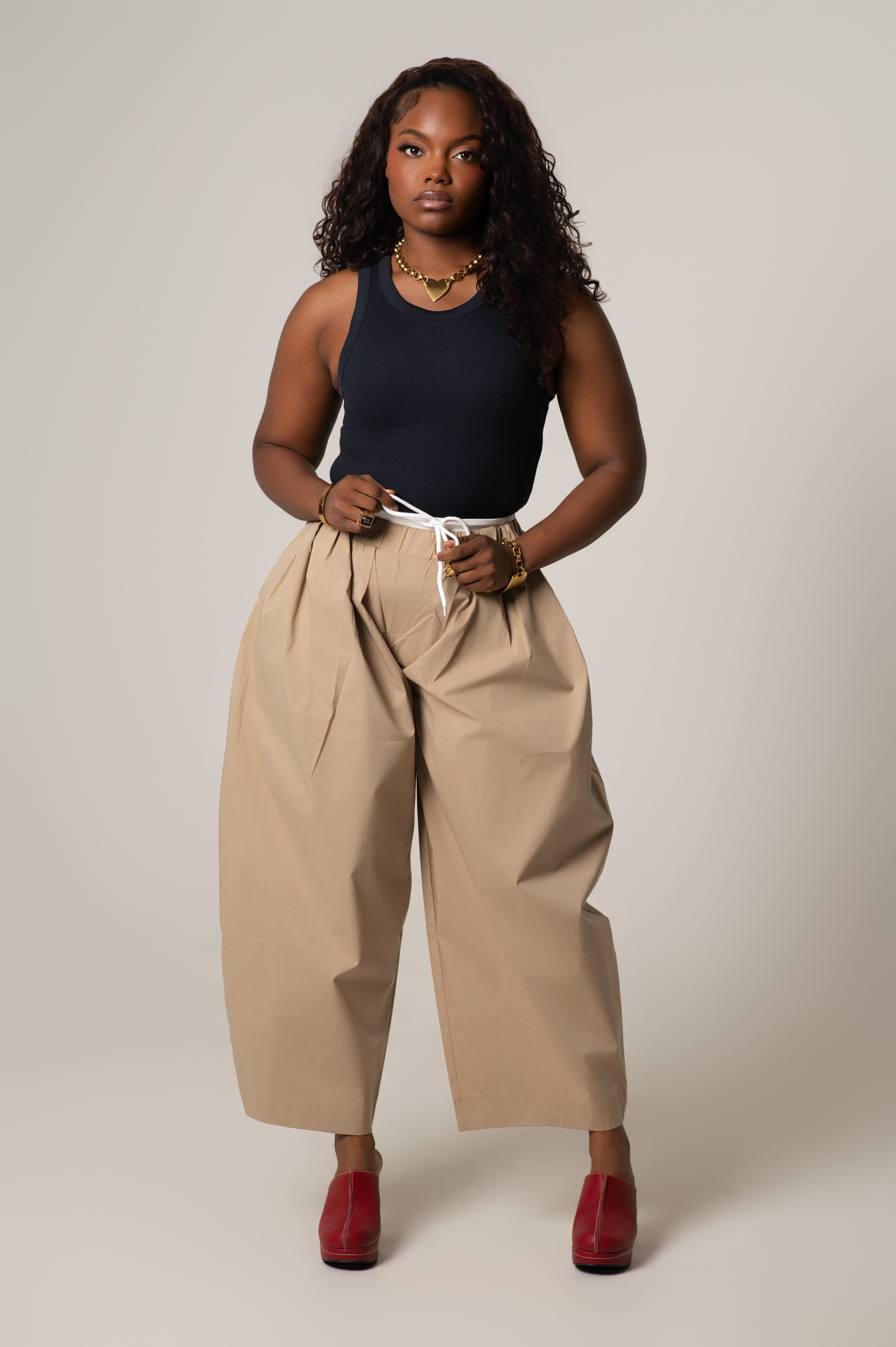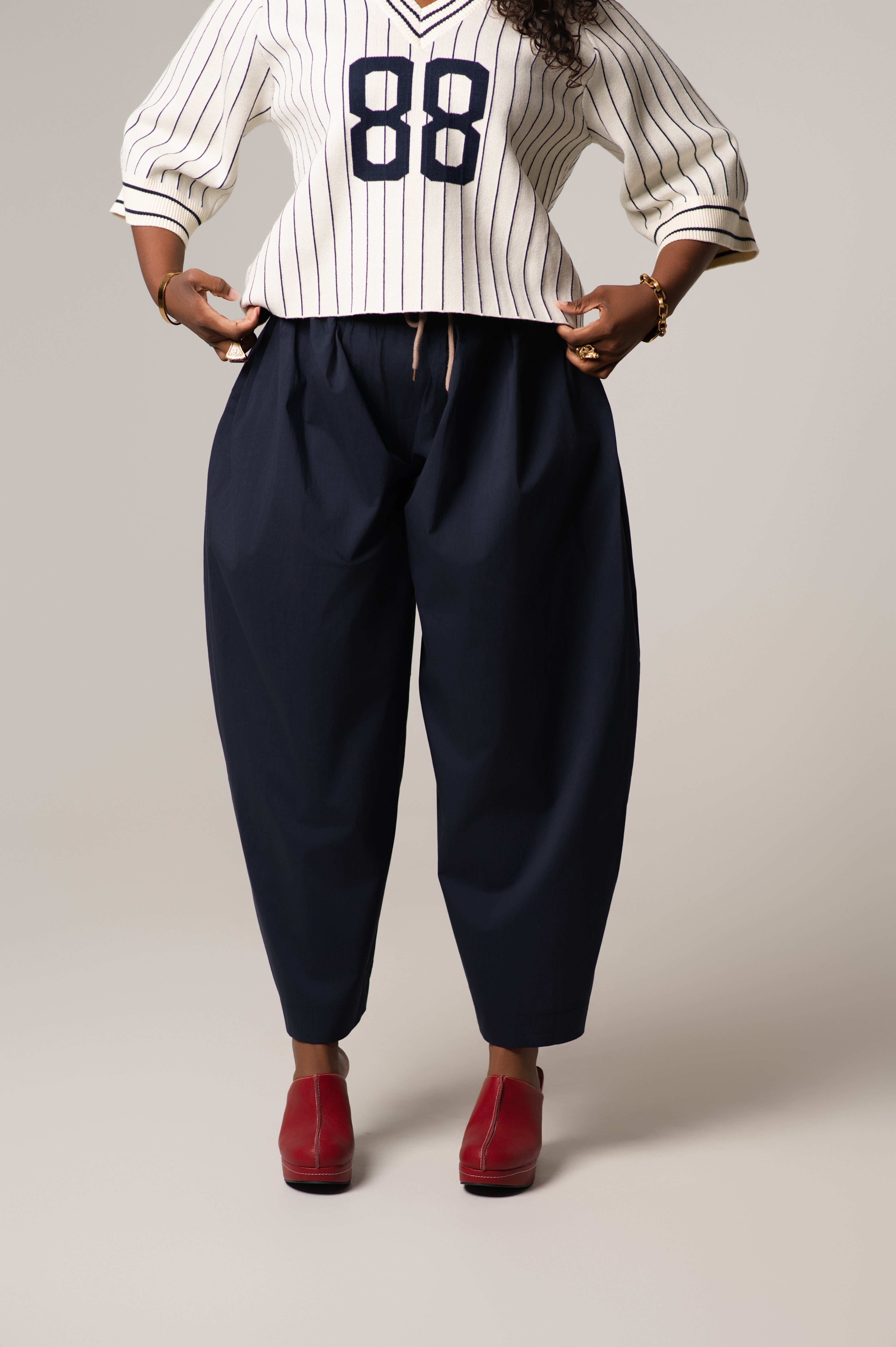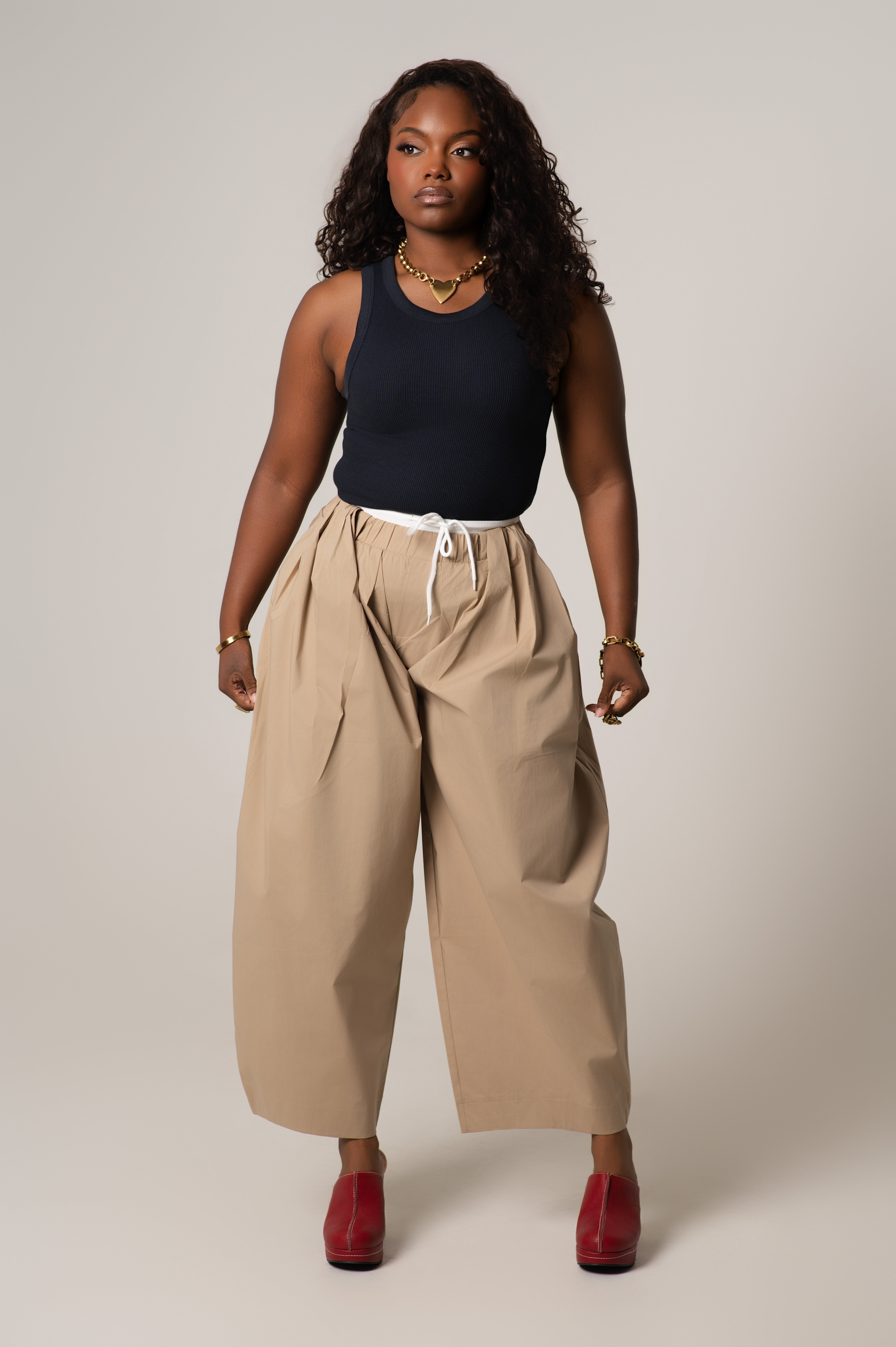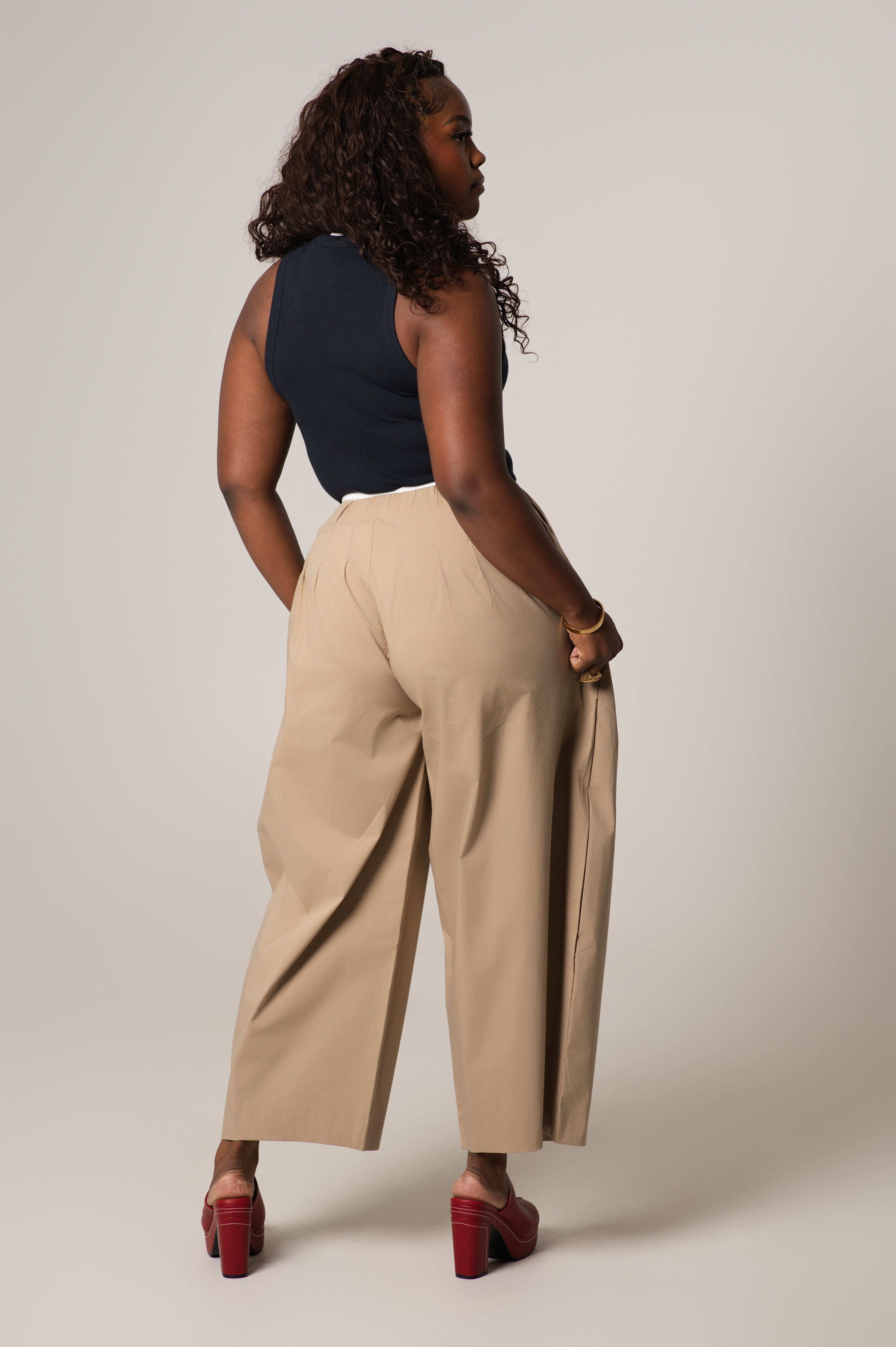 The Mady Cropped Barrel Nylon Pants are a lightweight and  functional staple. Designed with a subtle barrel leg and cropped length, these pants feature a contrasting color waistband that adds just the right amount of visual interest. Made from durable, lightweight nylon with a smooth finish, they’re perfect for transitional weather, off-duty days, or elevated casual looks.