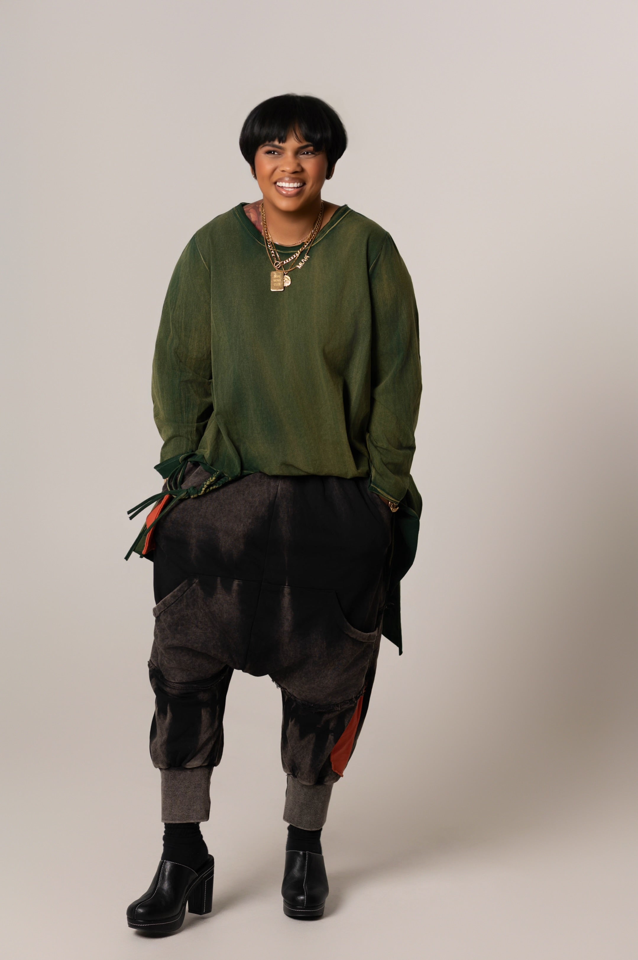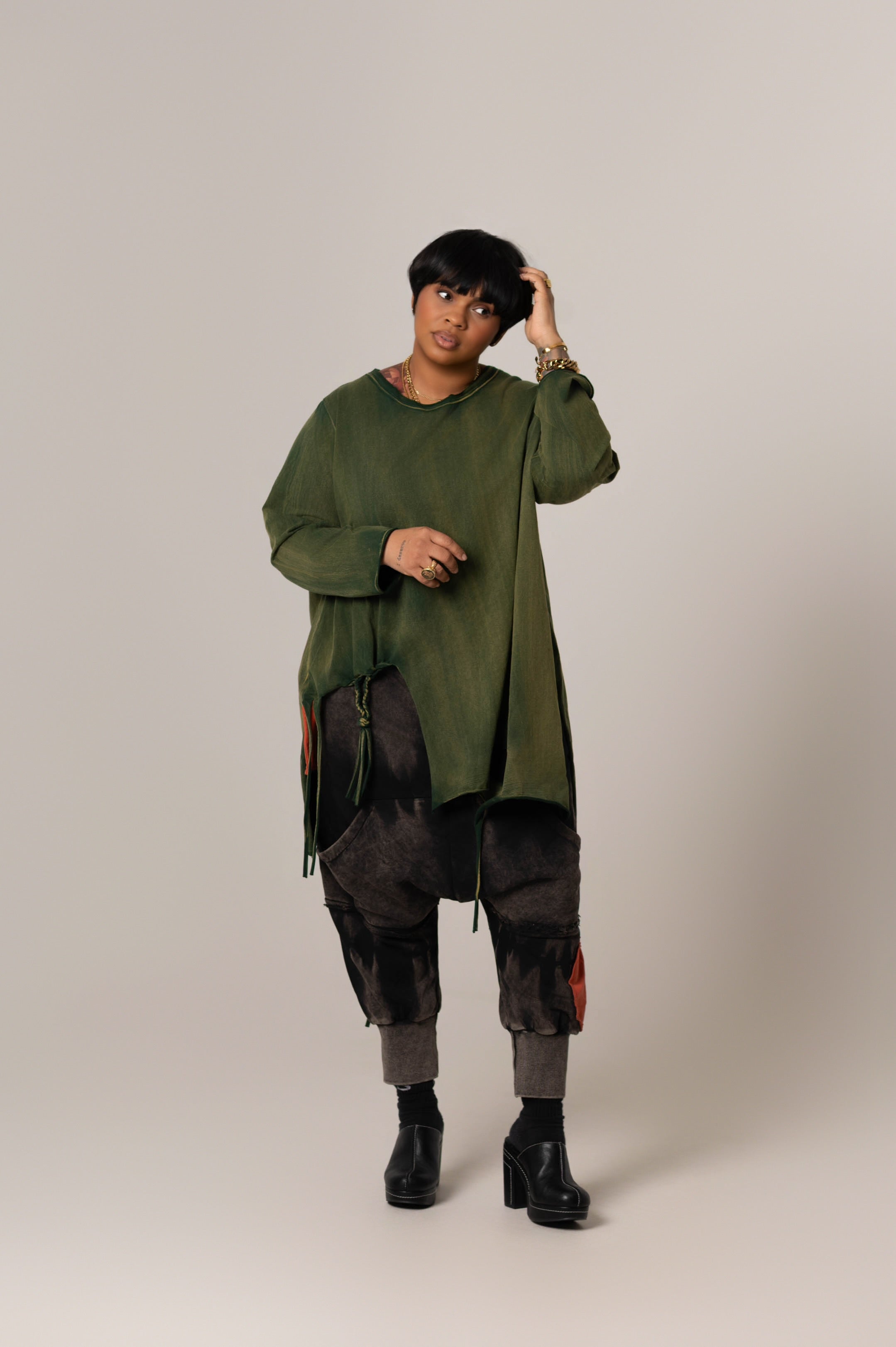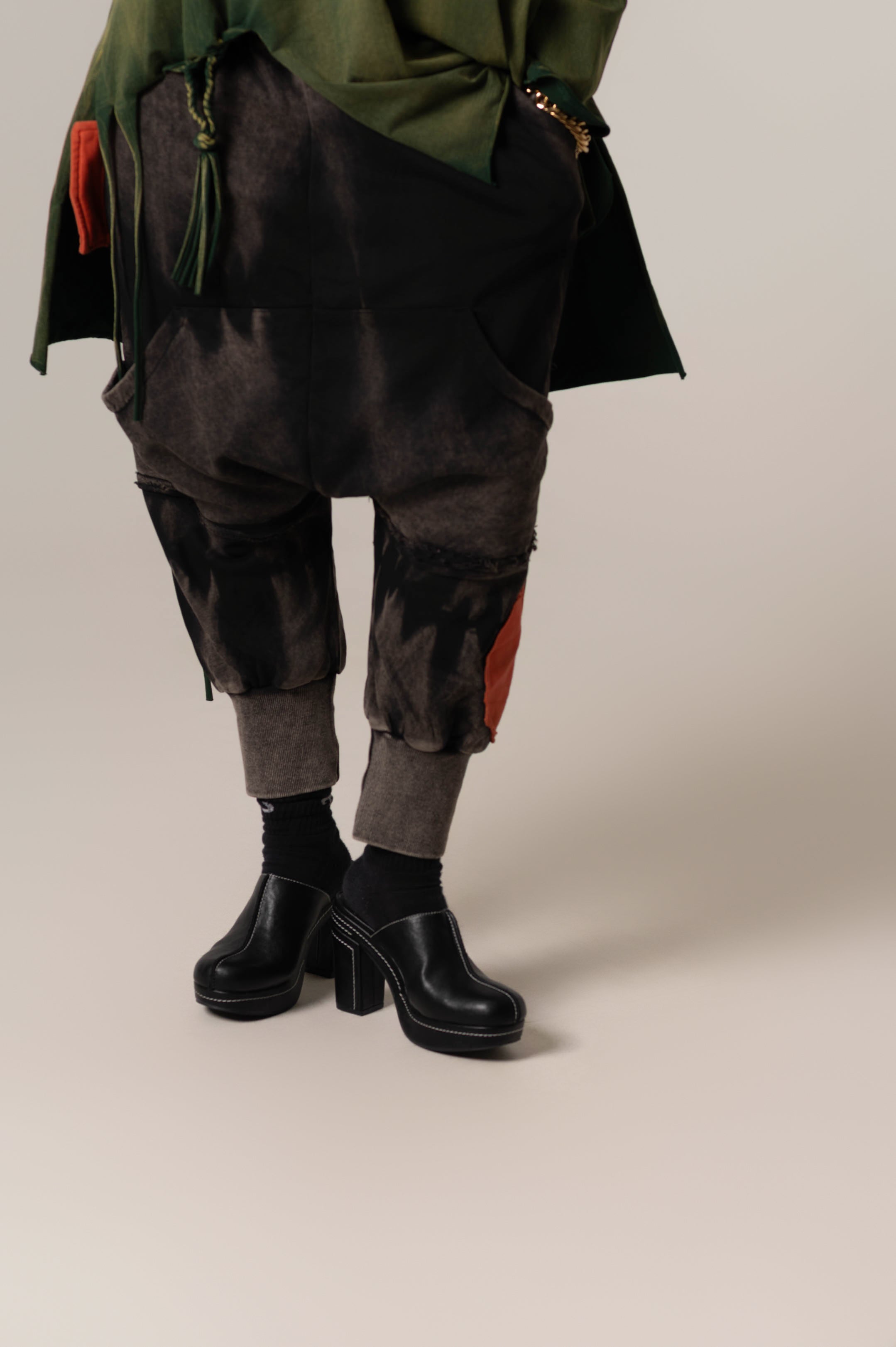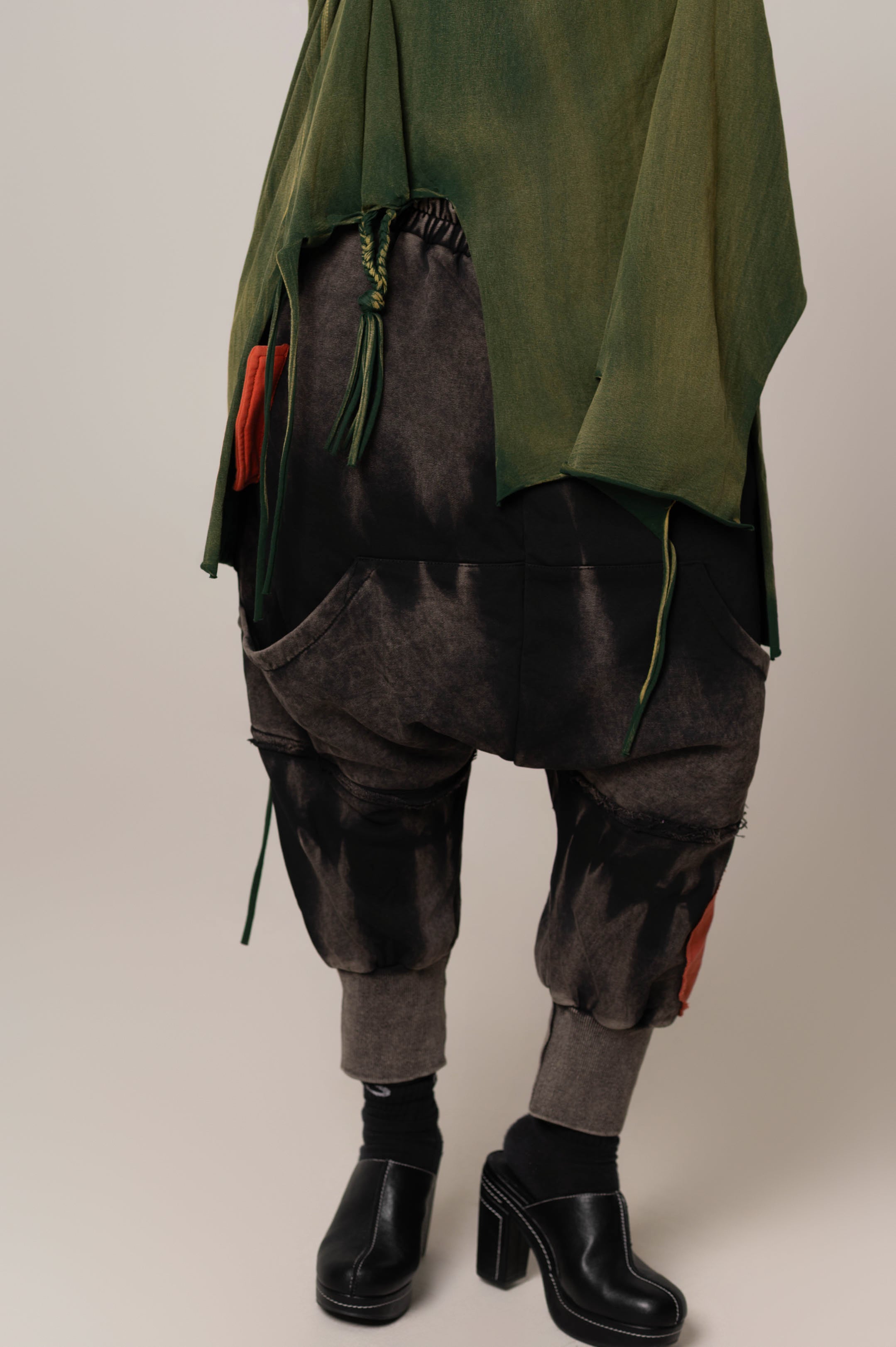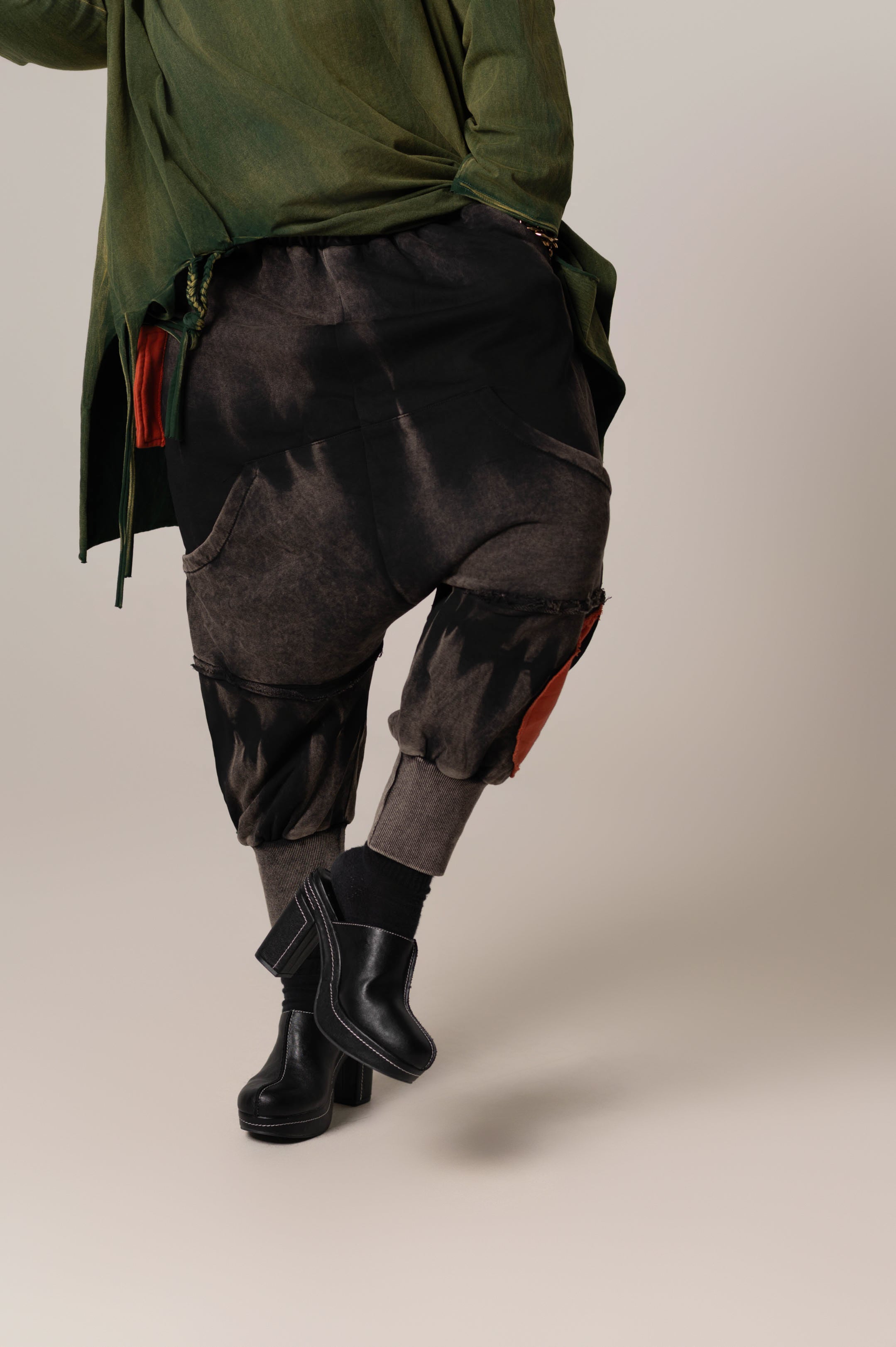 Acid Washed Harem Sweats deliver contemporary comfort with a drop-crotch silhouette in black featuring white acid wash and two striking orange patch details. One patch functions as a faux pocket, adding dimension to the design. The elastic waistband pairs with six thoughtfully positioned pockets—two back, two standard front, and two shallow front pockets—providing practical storage without bulk. A modern essential for elevated loungewear.