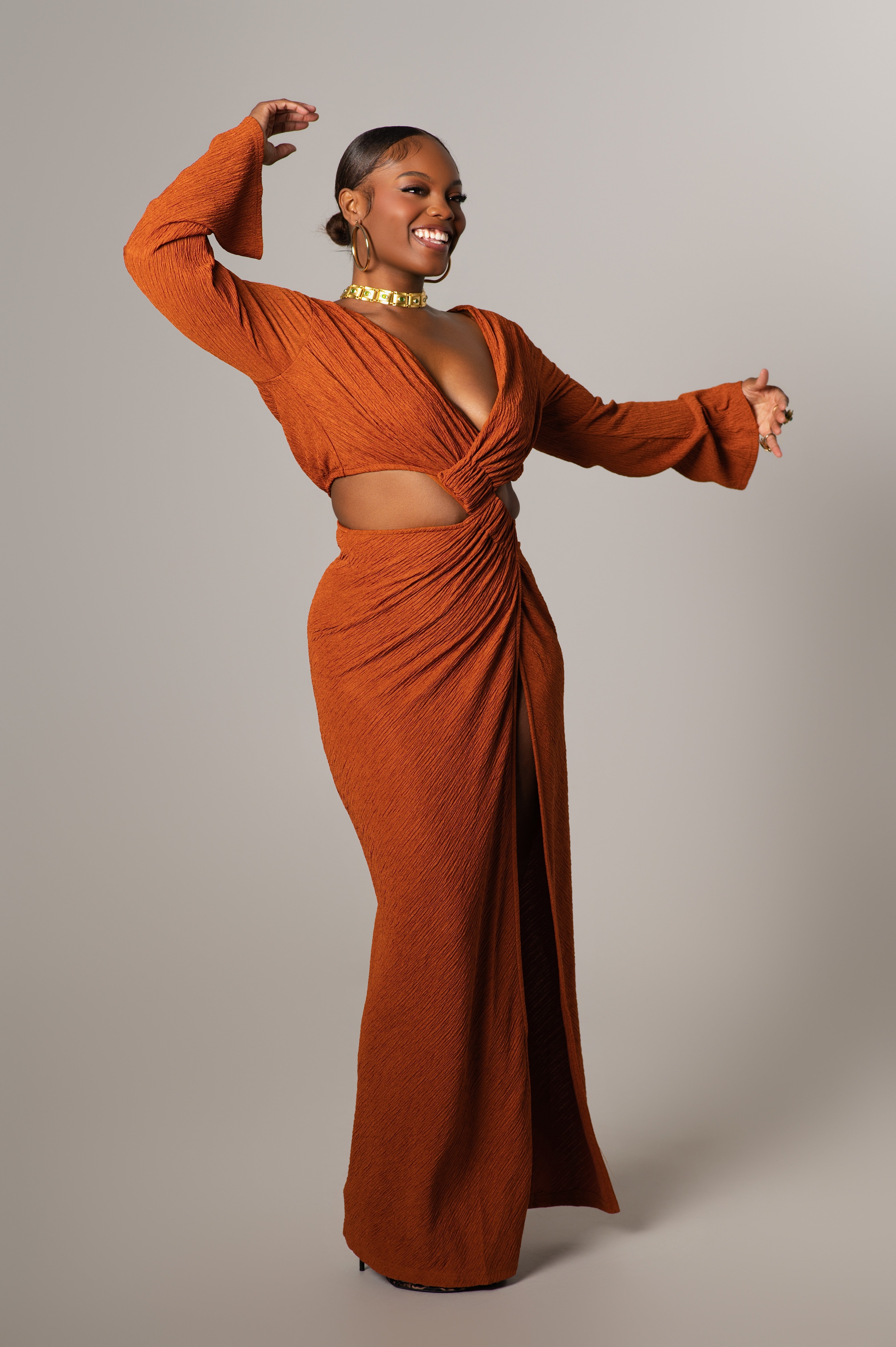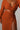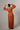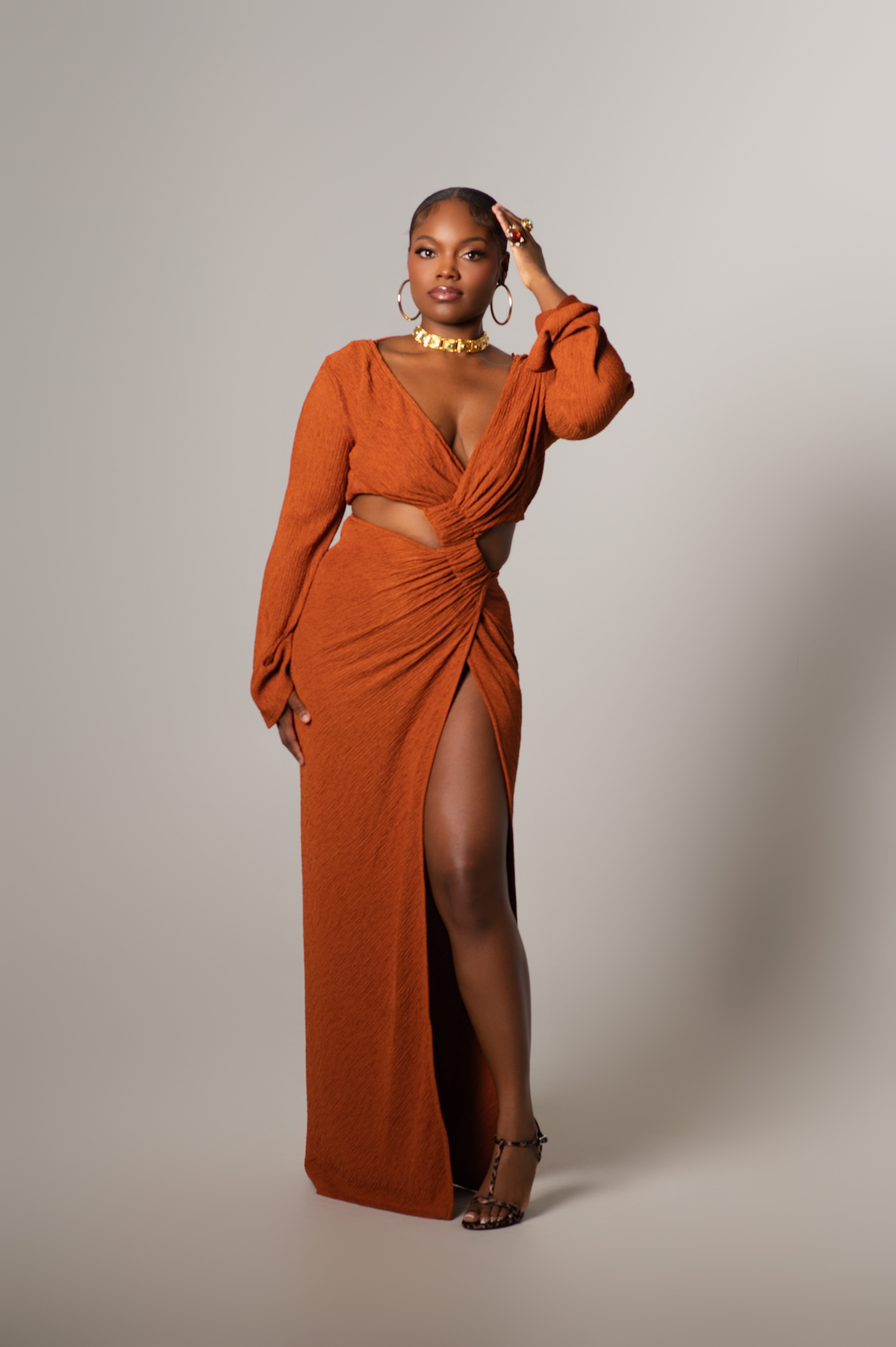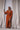 Features: Long sleeves, plunging V-neckline, side waist cut-out, thigh-high slit, bodycon silhouette, vibrant orange tone