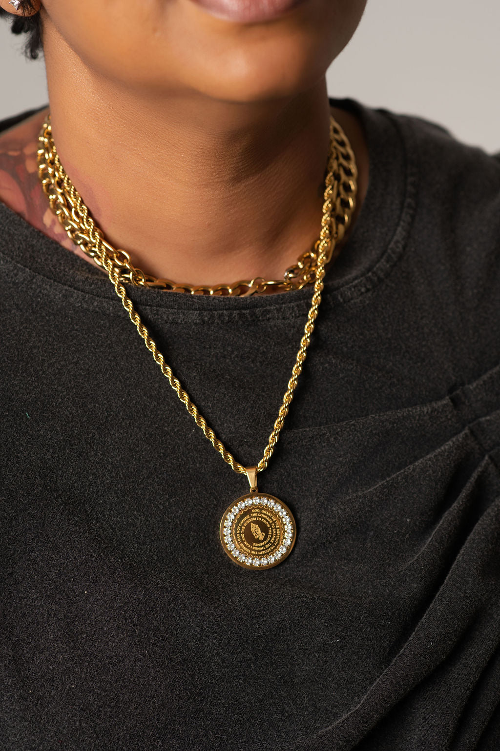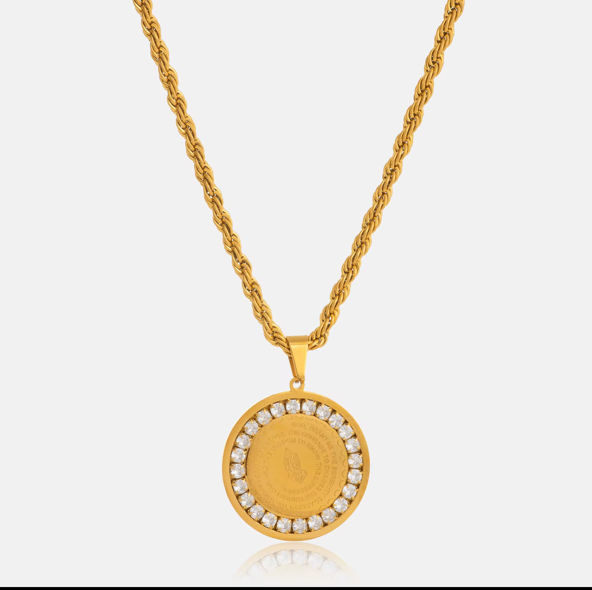 This Serenity Prayer Necklace features the powerful serenity prayer on one side and our father prayer on a delicate rope chain. Crafted with precision and care, this necklace serves as a constant reminder of strength, peace, and faith in daily life.